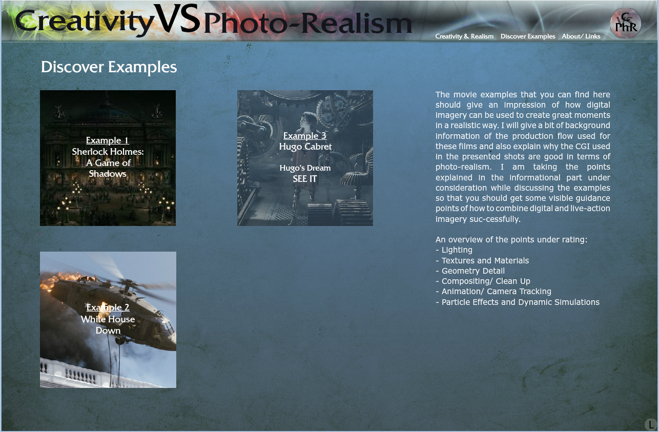 The second part takes three movie examples to give an impression of how digital imagery can be used to create moments in a realistic way. Taking the results of the theoretical dissertation under consideration for evaluating the movies, you can get an impression of how to combine digital and live-action imagery successfully.